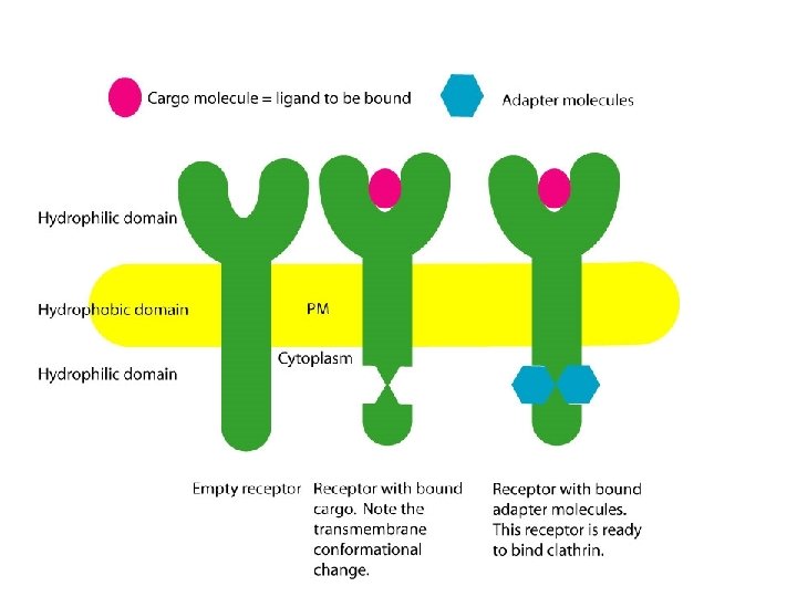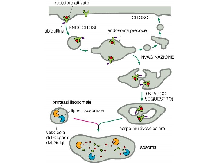 TAPPE DELLA ENDOCITOSI MEDIATA DA RECETTORE 1. INTERAZIONE LIGANDO-RECETTORE 2. LEGAME DELL’ADAPTINA AL RECETTORE 3. FORMAZIONE DEL COAT DI CLATRINA 4. INVAGINAZIONE DELLA MEMBRANA 5. FISSIONE 6. PERDITA DEL COAT DI CLATRINA 7. FUSIONE CON ENDOSOMI PRECOCI 8. ACIDIFICAZIONE 9. DISTACCO LIGANDO-RECETTORE 10. FORMAZIONE DI ENDOSOMI TARDIVI 11. TRASPORTO AI LISOSOMI E/O GOLGI (O RICICLO O TRANSCITOSI)