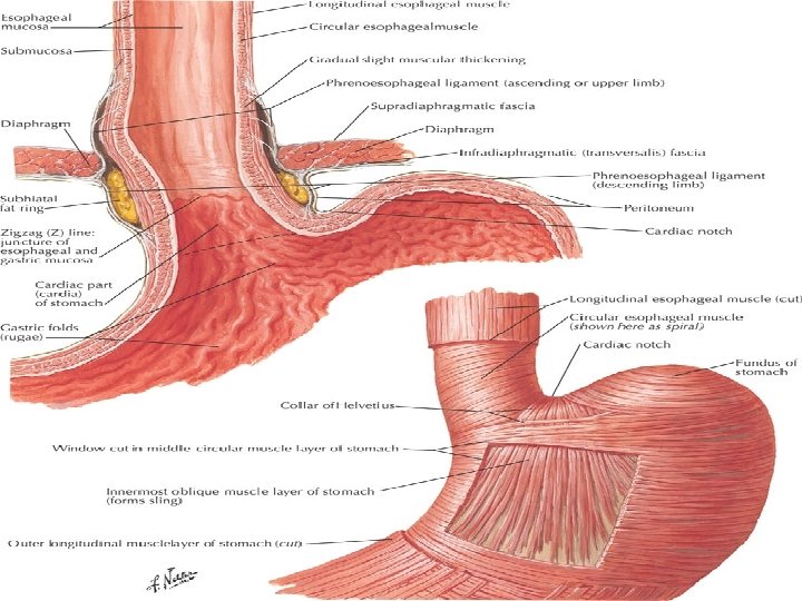 esophagus Anatomy: n n The esophagus is 25 cm. Long it starts at the level of the cricoid cartilage and end at the cardia. 2 cm of the esophagus lies below the diaphragm The esophagus has 2 sphincters upper (pharngeoesophageal sphincter) formed of striated muscle and lower sphincter formed of smooth muscle. The esophagus has 3 normal areas of narrowing: 1 st at the level of cricoid cartilage 15 cm from the incisors. 2 nd at the level of aortic arch and left bronchus 25 cm from the incisors. 3 rd at the diaphragm 40 cm from the incisors.