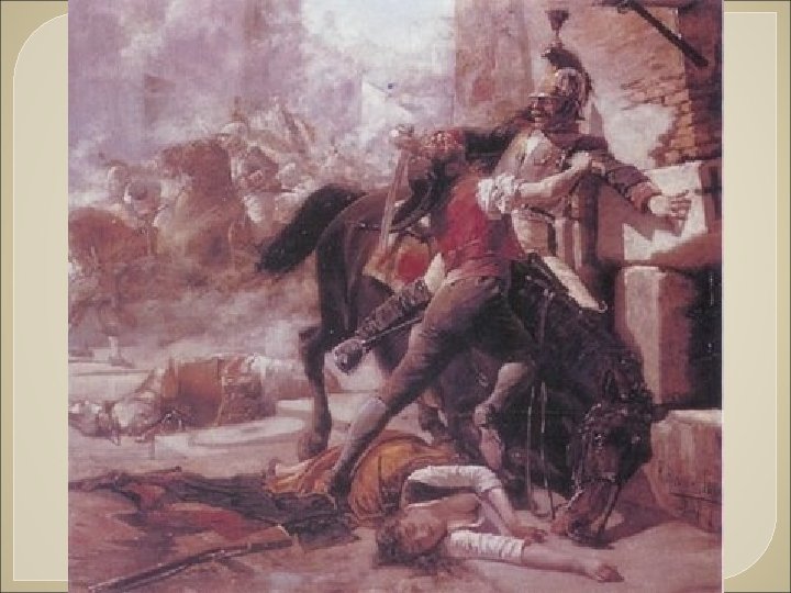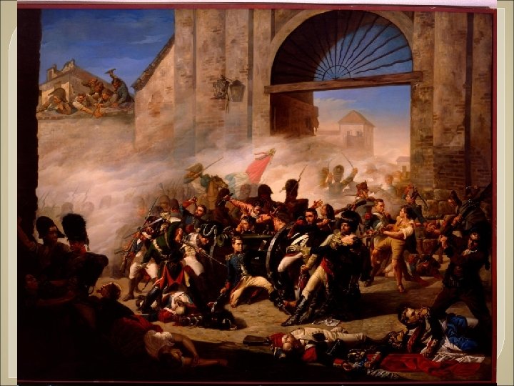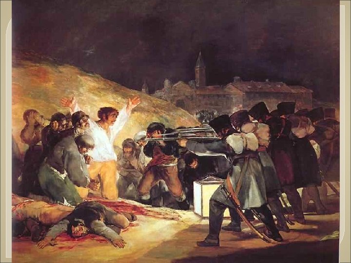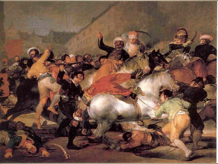 2 de mayo de 1808 ØEl pueblo de Madrid de manera espontánea se lanza contra los soldados franceses. ØEl ejército español se mantiene al margen siguiendo órdenes del Capitán General que obedece al general francés Murat. ØLos oficiales del Parque de Artillería de Monteléon: Daoiz , Velarde y Ruiz , se suman al levantamiento, muriendo en la lucha. ØTras un primer momento de desconcierto, las tropas francesas se hacen cargo de la situación iniciándose una dura represión contra la población de Madrid. (Fusilamientos del 3 de mayo. Goya)