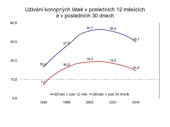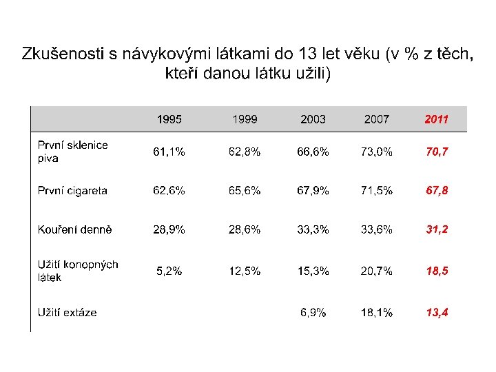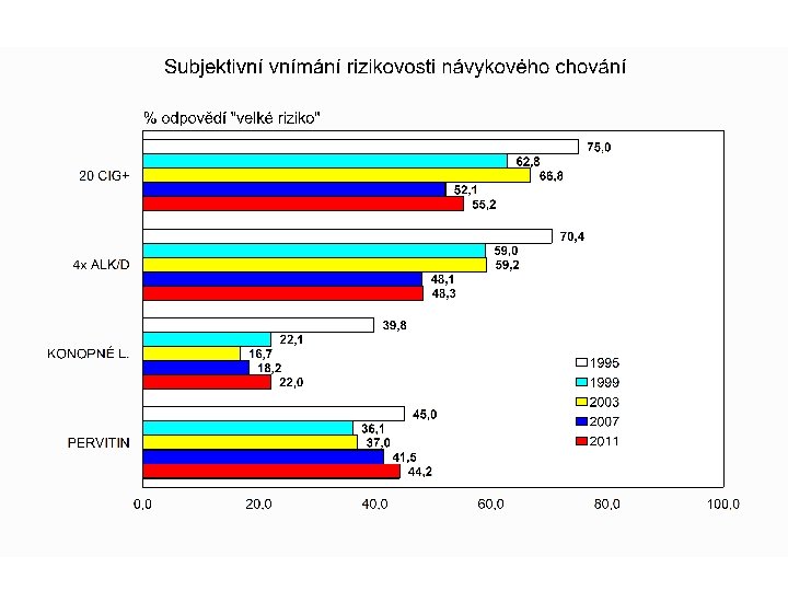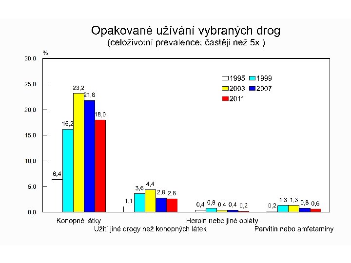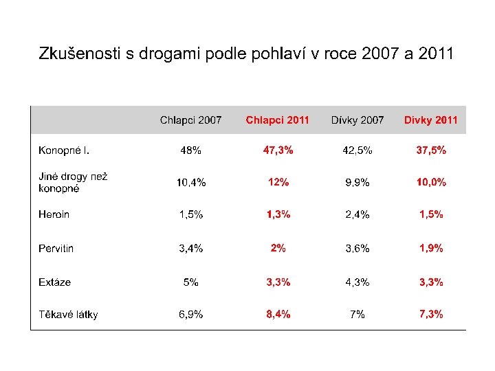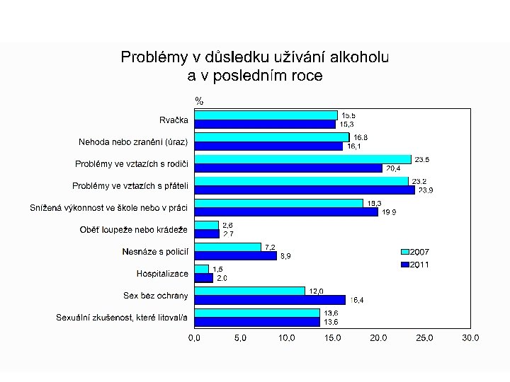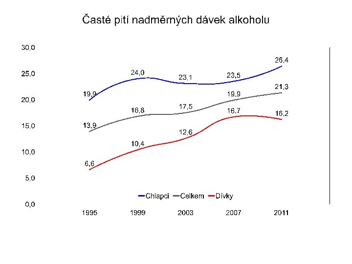 Kouření cigaret • 75 % dotázaných zkoušelo kouřit; • 42 % kouřilo v posledních 30 dnech; • denně kouří 25 % šestnáctiletých; • z nich je 8 % silných kuřáků (vykouří denně více než 11 cigaret). Podíl denních kuřáků mezi r. 2007 a 2011 se celkově nezměnil, mezi chlapci vzrostl z 7, 9 % na 10, 1 % a mezi děvčaty poklesl z 8, 4 % na 6, 4 %.