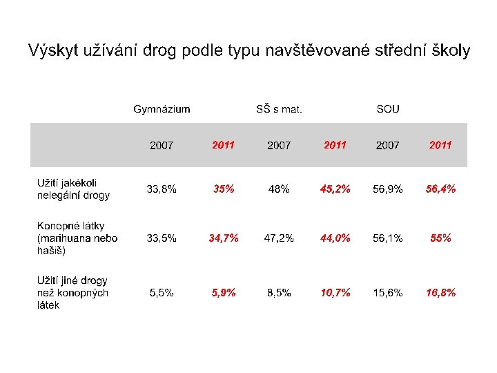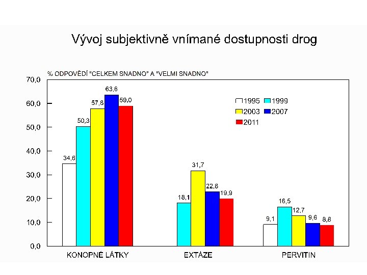 Význam studie • Popis rozsahu a forem užívání drog v populaci mládeže je informací, která má zásadní význam pro celospolečenskou diskusi o drogách a drogové politice. • Analýzy hlubších kontextových souvislostí staví na spolehlivých deskriptivních poznatcích. • Poznatky z dotazových šetření jsou sice pouze jedním zdrojem informací nutných pro koncipování politické strategie. Jsou ale také jednou z informací o tom, jak se politické cíle podařilo uskutečnit.
