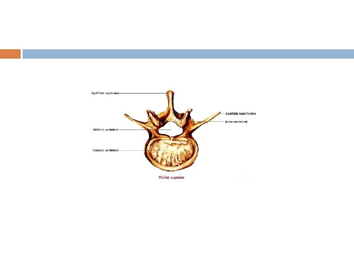 Vértebras Lumbares El cuerpo es voluminoso. El diámetro transverso es mayor que el antero posterior. El agujero es triangular. La apófisis espinosa es de cuadrilátera, y muy desarrollada de posición horizontal. Las apófisis transversas (apófisis costiformes) están relativamente poco desarrolladas. Se desprenden de la parte media del pediculo. Las apófisis articulares tienen una dirección vertical.