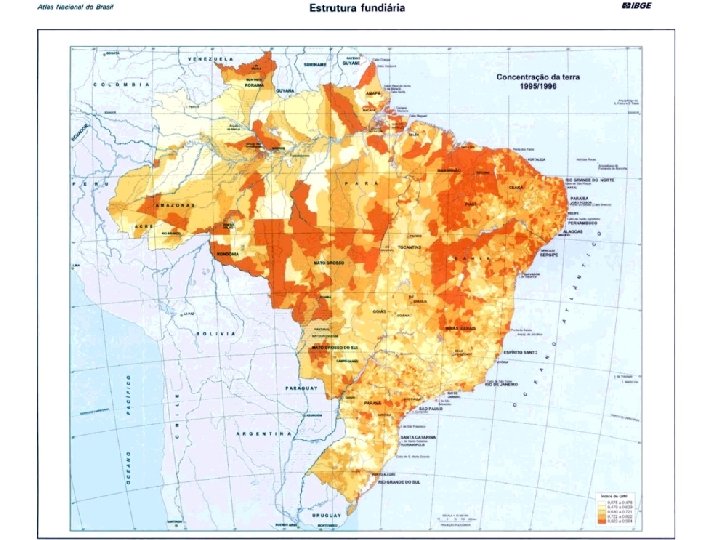 ESPAÇO AGRÁRIO BRASILEIRO ● ● ● O Brasil caracteriza-se pelo Agrobusiness ou agronegócio que é o conjunto de atividades que engloba desde o fornecimento de insumos e bens até a produção agropecuária, o processamento e a transformação das matérias-primas, destinados à distribuição e ao consumo interno e externo. A expansão das grandes áreas agrícolas modernas com objetivo de exportação, aumentou a concentração fundiária, expulsando pequenos proprietários que produzem para o mercado interno. O Brasil apresenta contrastes como a agricultura moderna e de subsistência, latifúndios improdutivos e pequenas propriedades, pecuária moderna e tradicional.