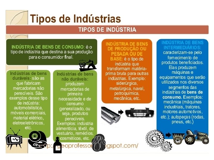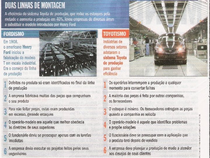 Modelos de Produção • Taylorismo - sistemas técnicos que objetivam a otimização do emprego da mão-de-obra de modo a aumentar a racionalização do movimento e evitar a ociosidade e a morosidade operária. • Fordismo - um processo industrial onde há produção em série, linhas de montagens, cada operário realiza uma tarefa específica, produção em massa. As fábricas ocupavam grandes áreas que exigiam um complexo sistema de controle. • Toyotismo – também um processo industrial, agora regulado por tarefas diárias, utilização de pequeno estoque, altos índices de terceirização. O espaço industrial é descentralizado, as peças são entregues diariamente e o controle sobre todo processo é mais dinâmico e simplificado.