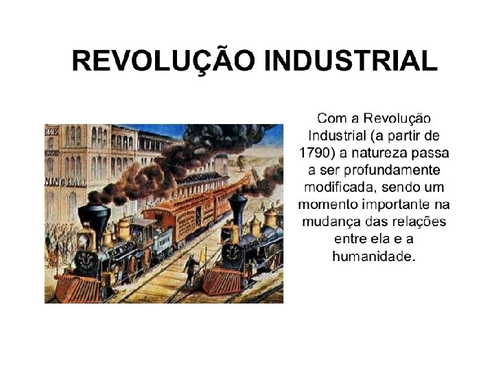 • Tanto o emprego quanto as transformações de matériasprimas passam a ser realizados de forma mecanizada, em menor tempo e em quantidades maiores. • Mudança nas relações de trabalho e estruturas sociais. • Mudança nas paisagens rurais e urbanas. • Intensa poluição atmosférica. • Crescimento populacional nas cidades • Longas jornadas de trabalho, condições insalubres, exploração do trabalho infantil. • Surgimento de associações de trabalhadores.