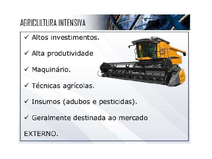 AGRICULTURA COMERCIAL • Produção destinada prioritariamente ao mercado externo • Utilização de modernas técnicas agrícolas • Facilidade de acesso ao crédito