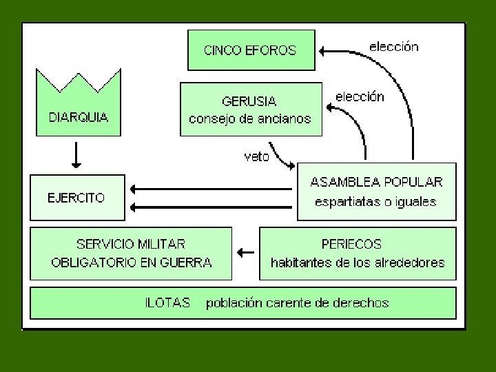 Obtener tierras objetivos Controlar el Peloponeso necesita - Control militar Educación militarizada Rigurosa disciplina y obediencia A cargo del Estado a partir de los 7 años No contaminarse con influencias extranjeras - Aislamiento cultural Oligarquía. “Oligo”: pocos (gobierno de pocos) - Organización política D 12 GOBIERNO Elegía a Asamblea Éforos (5) Controlaban a Gerusía (28) Elegía a Todos los espartanos mayores de 30 años - Aceptaba o no los proyectos de ley. Uno dirigía el ejército y el otro tenía funciones honoríficas Reyes (2): diarquía -Más de 60 años Funciones legislativas (proyectos de leyes) y veto - A Reyes y Funcionarios Administraban justicia