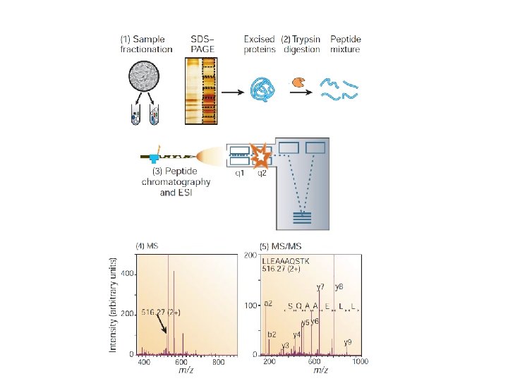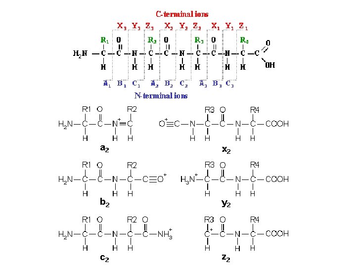 Espectrometría de masa b 1 y 4 b 2 y 3 b 3 y 2 b 4 y 1 b ions y ions Las m/z medidas por MS/MS se comparan con tablas de masas teoricas obtenidas con la secuencia del peptido, que puede ser obtenida de bases de datos http: //db. systemsbiology. net: 8080/proteomics. Toolkit/Frag. Ion. Servlet. html
