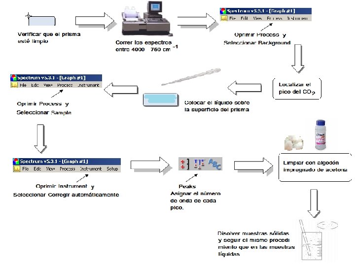 Espectro muestras liquidas Colocar en el prisma aprox. 2 ml de la muestra y cerrar compartimien to Ir a process y seleccionar sample Llenar los datos necesarios en la hoja desplegad a y oprimir OK Eliminar espectro del backgrou nd Oprimir el botón peaks para asignar el número de onda a cada pico Oprimir el botón instrum ent para corregir la línea base Si es necesario ajustar los valores de las coordenadas
