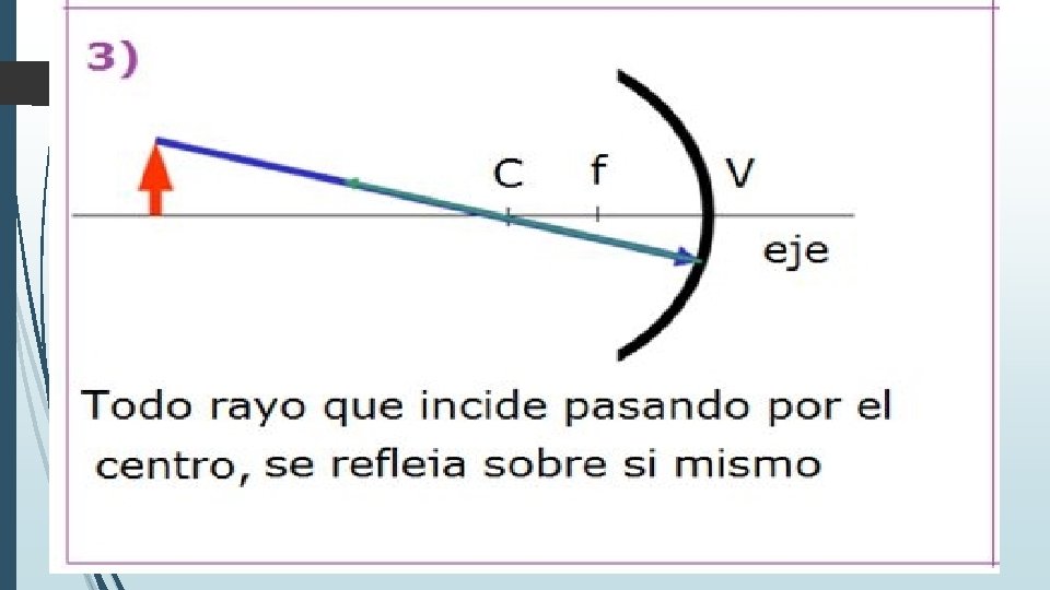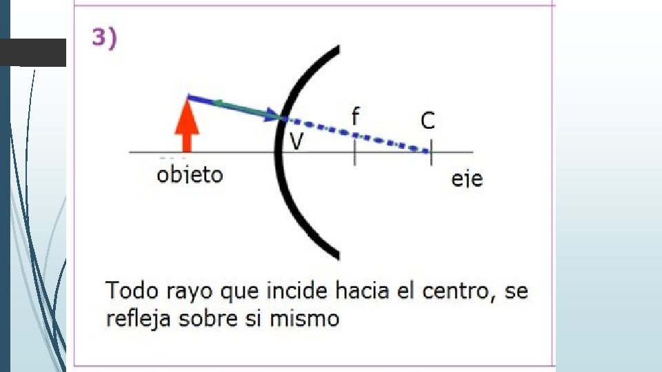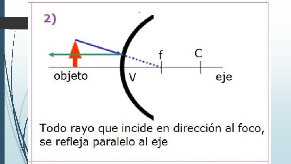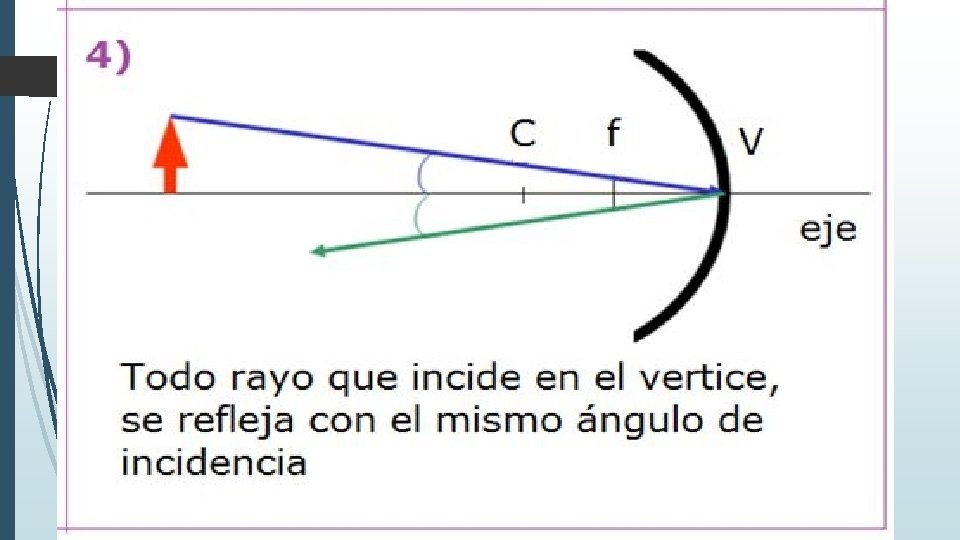 Imagen formada por un espejo cóncavo cuando el objeto esta entre el vértice y el foco. Virtual Derecha De mayor tamaño.