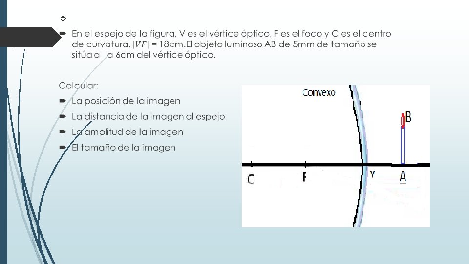 En la figura VC= 18 cm AV= 4 cm AB=5 mm Determinar: La posición de la imagen La distancia de la imagen al espejo La amplitud de la imagen El tamaño de la imagen