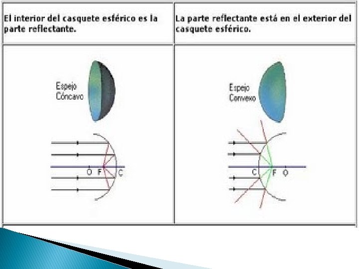 ¿Qué son los espejos cóncavos? � Los espejos cóncavos hacen converger los rayos luminosos paralelos. Se usan en los focos de los vehículos. Al colocar una ampolleta en el foco, los rayos salen paralelos. Se pueden producir imágenes reales y virtuales, dependiendo de la ubicación del objeto.