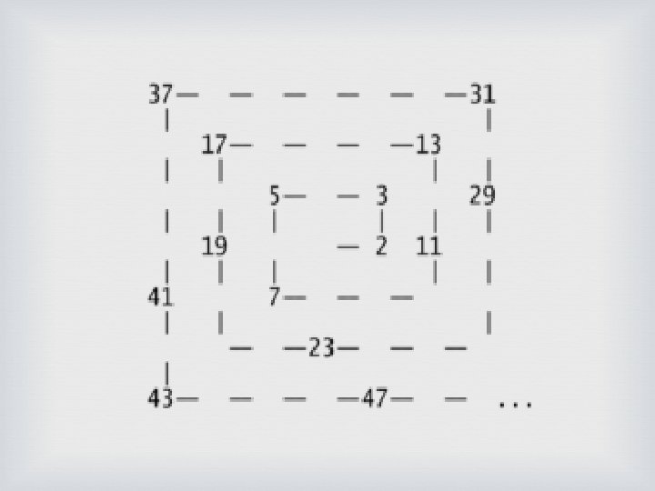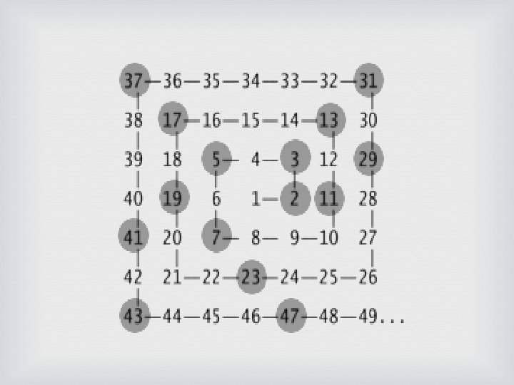 Ø Destacamos os números na espiral que são primos Ø No caso da espiral acima, devem ser destacados os números 2, 3, 5, 7, 11, 13, 17, 19, 23, 29, 31, 37, 41, 43 e 47 Ø Devemos descartar todos números que não haviam sido destacados anteriormente