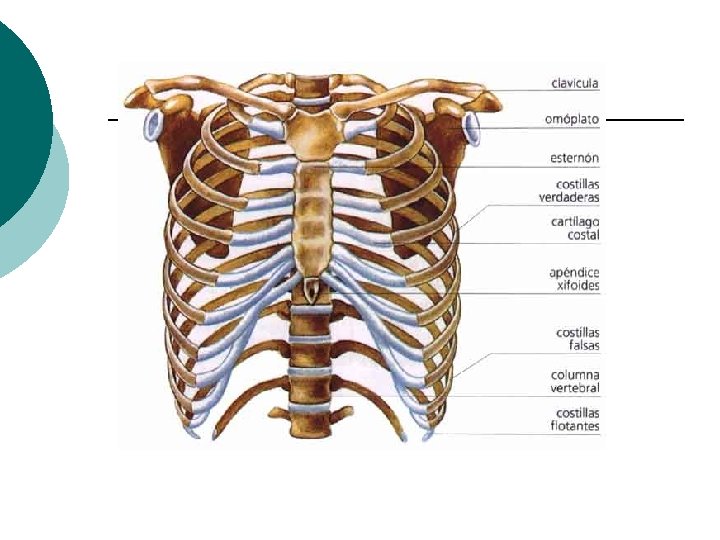 ESQUELETO HUMANO Tórax • 1 Esternón • 12 pares de costillas (total 24) 7 pares de costillas verdaderas (cada una tiene su cartílago individual para articularse al esternón) • 3 pares de costillas falsas (tienen un cartílago común con el que se articulan al esternón) • 2 pares de costillas flotantes (no se articulan con nada al frente) •