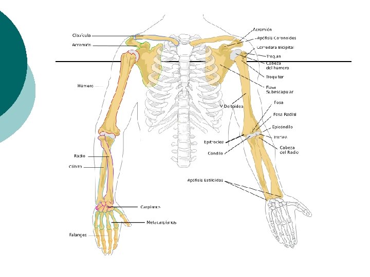 ESQUELETO HUMANO • Miembro superior (64 en total por ambos) • Hombro • Clavícula • Omóplato o escápula • Brazo • Húmero • Antebrazo • Cúbito • Radio • Mano • Carpo (8 huesos en dos filas) • Metacarpo (5 huesos largos, palma de la mano) • Dedos (14 falanges: 5 falanges, 4 falanginas y 5 falangetas)