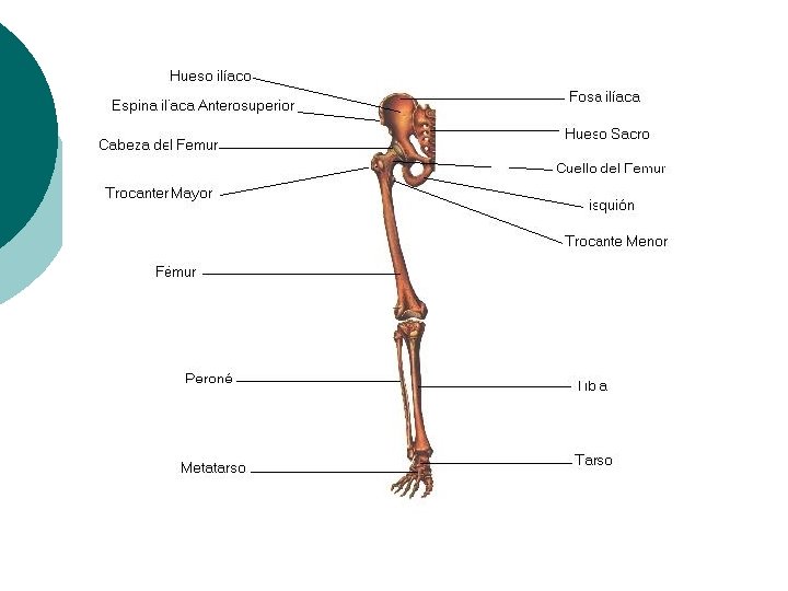 ESQUELETO HUMANO • Miembro inferior (62 en total por ambos) • Cadera • Iliaco • Muslo • Fémur • Rodilla • Rótula o patela • Pierna • Tibia §Peroné • Pie §Tarso (7 huesos en dos filas) §Metatarso (5 huesos largos, dorso del pie) §Dedos (14 falanges: 5 falanges, 4 falanginas y 5 falangetas)