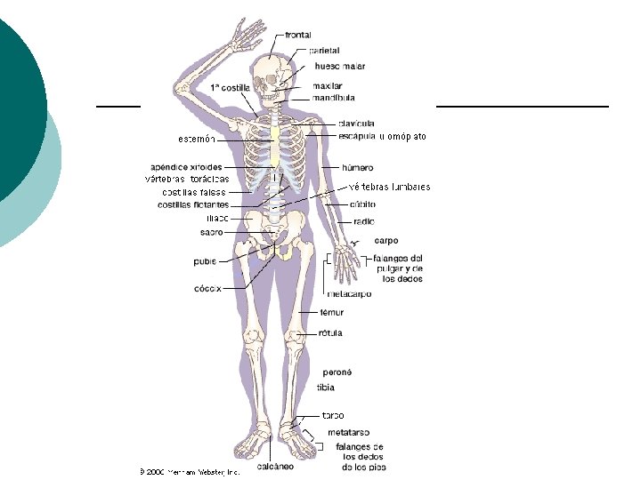 ESQUELETO HUMANO Consta de 206 huesos: - - 8 en el cráneo - 14 en la cara - 6 en el oído -1 hueso Hioides - 25 en el tórax -26 en la columna vertebral - 64 en los miembros superiores - 62 en los miembros inferiores