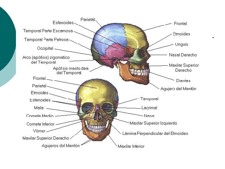 ESQUELETO HUMANO -Huesos -1 del cráneo frontal -2 parietales - 2 temporales - 1 occipital - 1 etmoides - 1 esfenoides Huesos de la cara - 13 en el maxilar superior - 1 en la maxilar inferior (mandíbula)