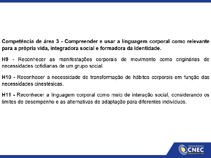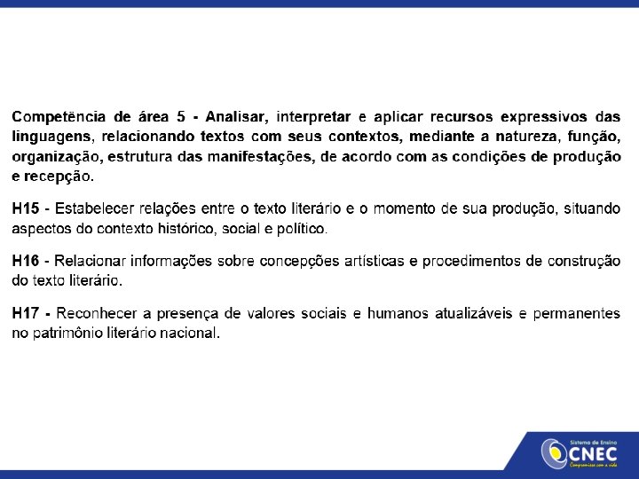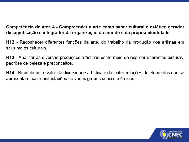 Competência de área 4 – Compreender a arte como saber cultural e estético gerador de significação e integrador da organização do mundo e da própria identidade. H 12 – Reconhecer diferentes funções da arte, do trabalho da produção dos artistas em seus meios Culturais.