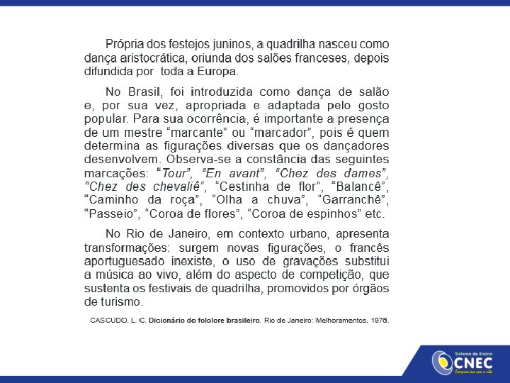 ENEM, 2009 A dança é importante para o índio preparar o corpo e a garganta e significa energia para o corpo, que fica robusto. Na aldeia, para preparo físico, dançamos desde cinco horas da manhã até seis horas da tarde, passa-se o dia inteiro dançando quando os padrinhos planejam a dança dos adolescentes. O padrinho é como um professor, um preparador físico dos adolescentes. Por exemplo, o padrinho sonha com um determinado canto e planeja para todos entoarem. Todos os tipos de dança vêm dos primeiros xavantes: Wamarĩdzadadzeiwawẽ, Butséwawẽ, Tseretomodzatsewawẽ, que foram descobrindo através da sabedoria como iria ser a cultura Xavante. Até hoje existe essa cultura, essa celebração. Quando o adolescente fura a orelha é obrigatório ele dançar toda a noite, tem de acordar meia-noite para dançar e cantar, é obrigatório, eles vão chamando um ao outro com um grito especial. WÉRÉ’ É TSI’RÓBÓ, E. A dança e o canto-celebração da existência xavante. Revista do Programa de Pós-Graduação em Arte da Un. B. V. 5, n. 2, dez. 2006