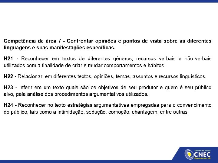 Competência de área 7 - Confrontar opiniões e pontos de vista sobre as diferentes linguagens e suas manifestações específicas. H 21 - Reconhecer em textos de diferentes gêneros, recursos verbais e não verbais utilizados com a finalidade de criar e mudar comportamentos e hábitos.