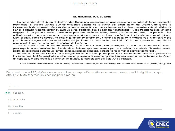 ENEM, 2011 Entre ideia e tecnologia O grande conceito por trás do Museu da Língua é apresentar o idioma como algo vivo e fundamental para o entendimento do que é ser brasileiro. Se nada nos define com clareza, a forma como falamos o português nas mais diversas situações cotidianas é talvez a melhor expressão da brasilidade. SCARDOVELI, E. Revista Língua Portuguesa. São Paulo: Segmento, Ano II, nº 6, 2006. O texto propõe uma reflexão acerca da língua portuguesa, ressaltando para o leitor a A. inauguração do museu e o grande investimento em cultura no país. B. importância da língua para a construção da identidade nacional. C. afetividade tão comum ao brasileiro, retratada através da língua. D. relação entre o idioma e as políticas públicas na área de cultura. E. diversidade étnica e linguística existente no território nacional. B
