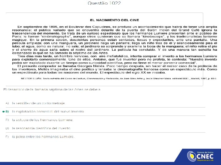 ENEM/2010 D “Todas as manhãs quando acordo, experimento um prazer supremo: o de ser Salvador Dalí. ” NÉRET, G. Taschen, 1996. A representação do onírico é uma das principais características da Assim escreveu o pintor dos chamas” em 1931. o. Esse pintura surrealista de “relógios Salvadormoles” Dalí. e Adas “girafas relaçãoem intrínseca entre artista excêntrico deu apoio ao general Franco durante a Guerra Civil Espanhola e, por esse surrealismo e as pesquisas de Sigmund Freud no campo da interpretação motivo, foi afastado movimento surrealista por seu André Breton. Dessa forma, dos sonhos deudo origem ao que se chamou de líder, “método de interpretação Dalí criou seu próprio estilo, sebaseado na interpretação dos esonhos e nos estudos paranoico”, em que misturam consciente inconsciente no de Sigmund Freud, denominado “método de que interpretação Esse método desenvolvimento de um estilo único marcou oparanoico”. trabalho do autor dos era constituído por textos visuais que demonstram imagens “relógios moles” e das “girafas em chamas”. A. do fantástico, impregnado de civismo pelo governo espanhol, em que a busca pela emoção e pela dramaticidade desenvolveram um estilo incomparável. B. do onírico, que misturava sonho com realidade e interagia refletindo a unidade entre o consciente e o inconsciente como um universo único ou pessoal. C. da linha inflexível da razão, dando vazão a uma forma de produção despojada no traço, na temática e nas formas vinculadas ao real. D. do reflexo que, apesar do termo “paranoico”, possui sobriedade e elegância advindas de uma técnica de cores discretas e desenhos precisos. E. da expressão e intensidade entre o consciente e a liberdade, declarando o amor pela forma de conduzir o enredo histórico dos personagens retratados.