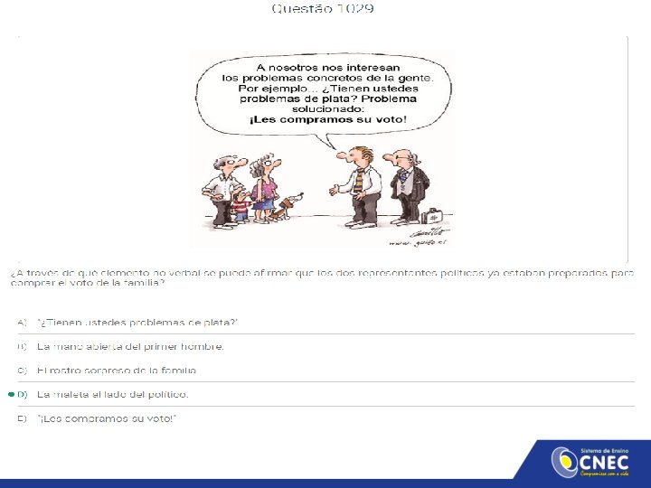A educação é um assunto de amplo interesse em diversos setores, principalmente o escolar e o familiar. O cartum utiliza um apelo humorístico para alertar o leitor sobre A) o prejuízo que os meios de comunicação podem trazer à educação. B) a total alienação das crianças e dos adolescentes, influenciados pela mídia. C) a terceirização da educação, nos dias de hoje, que fica a cargo, majoritariamente, da escola. D) a comodidade dos alunos, muitas vezes corroborada pelos pais, fato que os deixa incapazes de produzir intelectualmente. E) o modelo de educação dado aos jovens e adolescentes, que, muitas vezes, fica a cargo dos meios de comunicação modernos.
