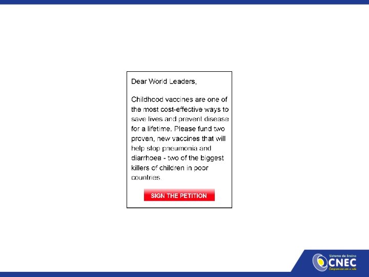 H 6 – Utilizar os conhecimentos da LEM e de seus mecanismos como meio de ampliar as possibilidades de acesso a informações, tecnologias e culturas. Help save 4 million lives in the next 5 years Apr 18 th, 2011 11: 37 AM UTC By Stuart Mc. William I recently found out that we could save 4 million kids' lives in the next 5 years. How? With 2 new vaccines that could drastically reduce child deaths in poor countries from 2 diseases, which cause pneumonia and diarrhoea. However, it's one thing having these vaccines available; it's another getting them safely to the places where they are needed. That's where you come in. In a few weeks world leaders are meeting to decide how much they will pledge to support the roll out of these vaccines in developing countries. You can help protect children for a lifetime by adding your name to our petition. Nearly 1 out of 3 child deaths is caused by these two diseases. But they don't only kill, they also make children ill. Fewer sick kids means more time in school, less strain on health services, and healthier future generations. [. . . ] Available at: <http: //www. one. org/international/blog/>. Access on: July 06, 2011. [Adapted]
