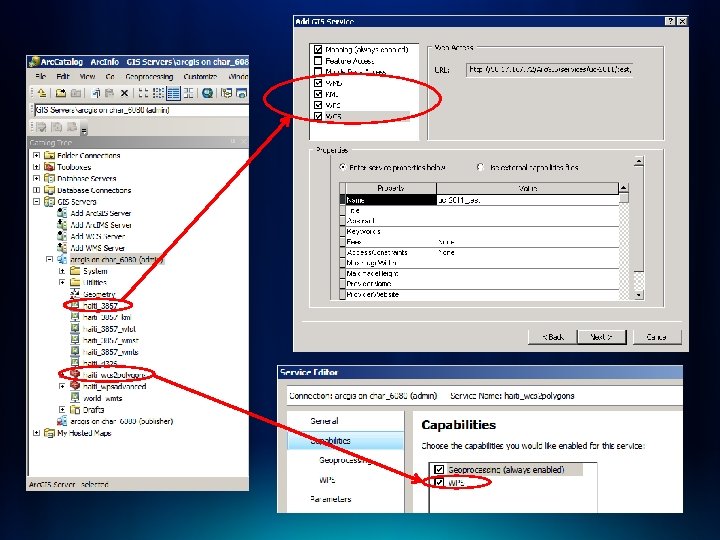 OGC Services in Arc. GIS Server - Architecture Implemented as capabilities of Arc. GIS Server services - Map Service - WMS, WCS, WFS, KML, WMTS (10. 1) - Image Service - WMS, WCS, KML - Geo. Data Service - WCS, WFS, KML - Geoprocessing Service - WPS (10. 1)