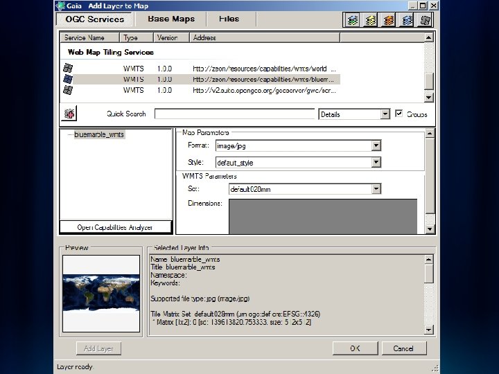 WMTS Demo • Leverage Arc. GIS Server WMTS in Open. Layers • Leverage Arc. GIS Server WMTS in Arc. GIS Script API • Leverage Arc. GIS Server WMTS in Gaia (screenshot) • Leverage Arc. GIS Server WMTS in u. Dig (screenshot)