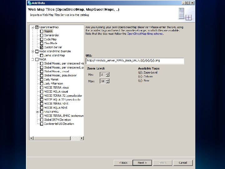 WMTS in Arc. GIS Server (10. 1 Only) • Serving pre-cached map tiles – Version implemented • 1. 0. 0 – WMTS interfaces implemented • Get. Capabilities • Get. Tile