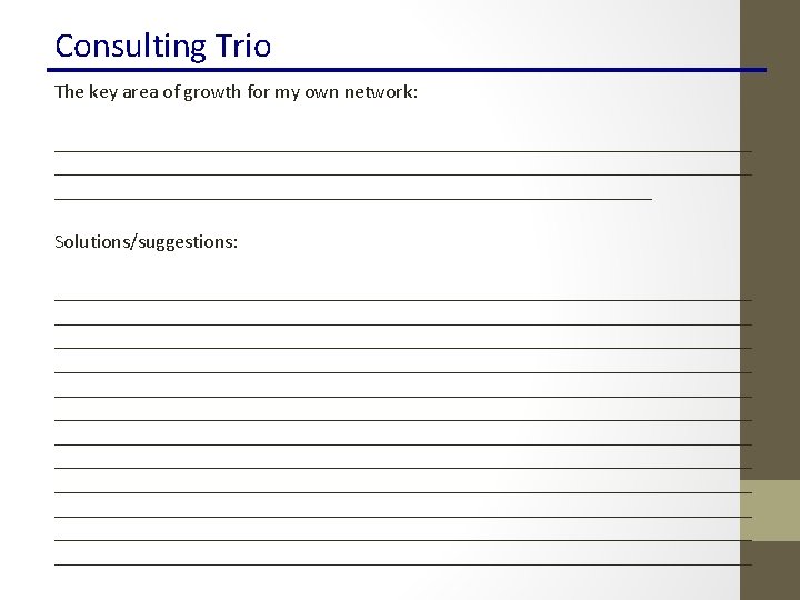Consulting trio Form a trio with people you don’t interact with often. Letter off A, B, C. Consulting Round 1. A presents to B and C key identified area of improvement for her own network in 1 minute. B and C offers best posible advice – 2 minutes each. Consulting Round 2. B presents to C and A key identified area of improvement for her own network in 1 minute. C and A offers best posible advice – 2 minutes each. Consulting Round 3. C presents to A and B key identified area of improvement for her own network in 1 minute. A and B offers best posible advice – 2 minutes each.