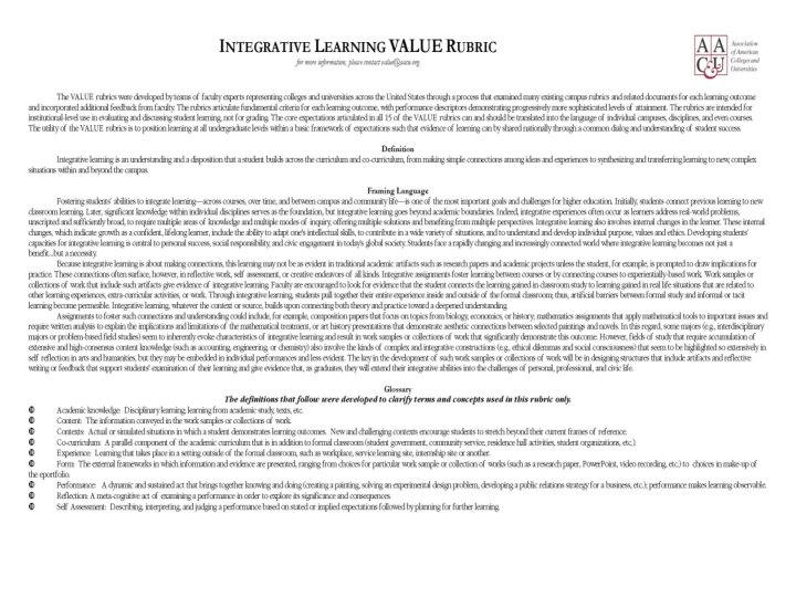 Capturing What Matters: VALUE Rubrics Initiative Rubric Development � 16 rubrics � Created primarily by teams of faculty � Inter-disciplinary, interinstitutional � Three rounds of testing and revision on campuses with samples of student work � Intended to be modified at campus-level Utility � Assessment of students’ demonstrated performance and capacity for improvement � Faculty-owned and institutionally shared � Used for students’ selfassessment of learning � Increase transparency of what matters to institutions for student learning