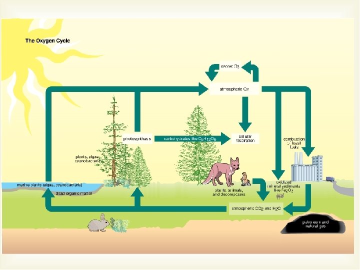 Oxygen Cycle = process where oxygen is cycled b/w atmosphere, ocean, & organisms ❧ All organisms need Oxygen 1. Producers release O 2 during photosynthesis ❧CO 2 + H 2 O + sun → C 6 H 12 O 6 + O 2 2. Organisms use O 2 during cellular respiration ❧ C 6 H 12 O 6 + O 2 → CO 2 + H 2 O + energy 3. O 2 is stored: ❧Dissolved in oceans ❧Oxygen in the atmosphere: ❧ O 2 is 21% of lower atmosphere ❧ Ozone (O 3) in upper atmosphere protects us from UV rays