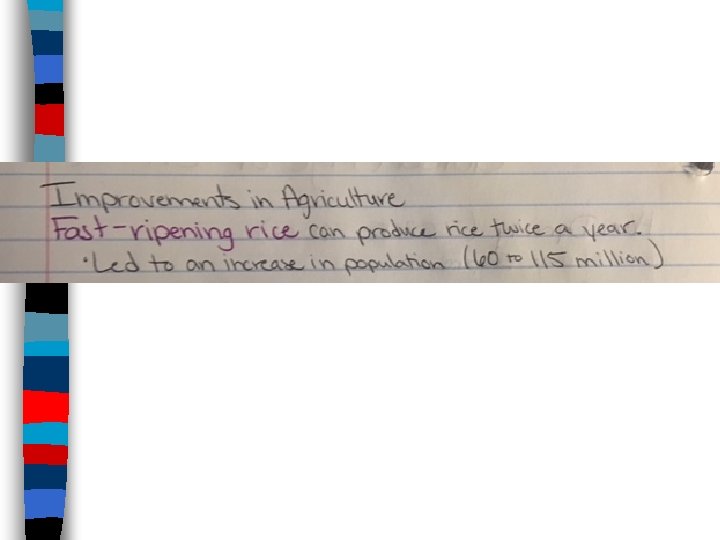 Improvements in Agriculture ■ Fast-Ripening Rice ( got this from the Vietnamese after military expansion) Now they can produce rice twice a year!! ■ Increased Agricultural production ■ Population Growth (60 to 115 million)