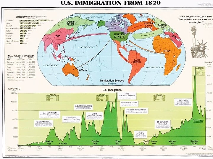 Immigration to the United States • Three Phases of Immigration to the United States – First Wave – Colonial Period 1600 s – 1700 s • English/ Scots Irish Immigrants – Family immigration first in New England (largest population growth during colonial period) – Second Wave – 1840 s – 1920 s • 1840 s – 1870 s = Irish & German Immigrants (Northern European) – Irish = Potato Famine and ‘the Troubles’ continue to create push factors • 1870 s – 1920 s = Italian & Polish immigrants (Southern and Eastern European) – Often chain migration (one family member makes enough $ to send of other family members) or Temporary Migration (return to home country after a few years) – depends on push factors – Third Wave – 1965 (Immigration Leg. ) – Present • Current Immigration primarily from Asian, Latin America (Mexico) • Often Circle Migration