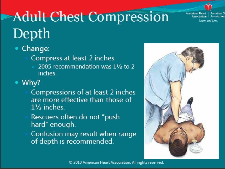 Adult Chest Compression Depth: Updated Recommendation: • Compress at least 2 inches (5 cm) for average adult • Avoid excessive compression depth ie, greater than 2. 4 inches (6 cm) Why? – Small study: more injuries with compressions greater than 2. 4 inches (6 cm). (Hellevuo et al, Resuscitation, 2013) Note: • Difficult to judge depth without devices • Rescuers typically don’t “push hard” enough