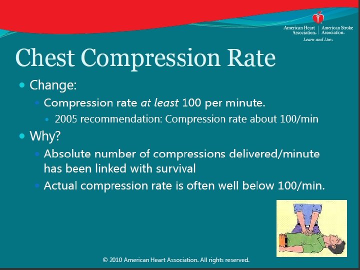 Chest Compression Rate: Updated Recommendation: • Compression rate: 100120/minute (2010: at least 100/min). Why? • Absolute number of compressions delivered/minute linked with survival. • Actual compression rate often well below 100/minute. • Rates below 100/min or above