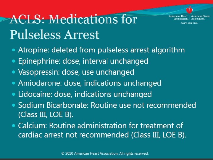 Vasopressors in Cardiac Arrest Recommendations: • Vasopressin + epinephrine offers no advantage over standard dose epinephrine—vasopressin has been deleted from AHA ACLS Cardiac Arrest Algorithm. • It may be reasonable to administer epinephrine as soon as feasible after the onset of cardiac arrest with initial nonshockable rhythm Why? • No benefit of vasopressin over epinephrine • Very large observational study found association of better outcome (increased ROSC, survival to hospital discharge, and neurologically intact survival) with earlier epinephrine for