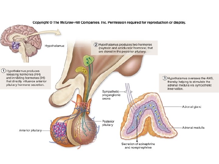 Hypothalamic Control of the Endocrine System • Hypothalamus produces two hormones that are transported to and stored in the posterior pituitary. – oxytocin – antidiuretic hormone (ADH) • Hypothalamus directly oversees the stimulation and hormone secretion of the adrenal medulla. – An endocrine structure that secretes its hormones in response to stimulation by the sympathetic nervous system. • Some endocrine cells are not under direct control of hypothalamus.