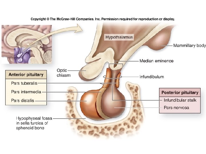 Pituitary Gland (Hypophysis) • lies inferior to the hypothalamus. • Small, slightly oval gland housed within the hypophyseal fossa of the sphenoid bone. • Connected to the hypothalamus by a thin stalk, the infundibulum. • Partitioned both structurally and functionally into an anterior pituitary and a posterior pituitary. – (called anterior lobes and posterior lobes)