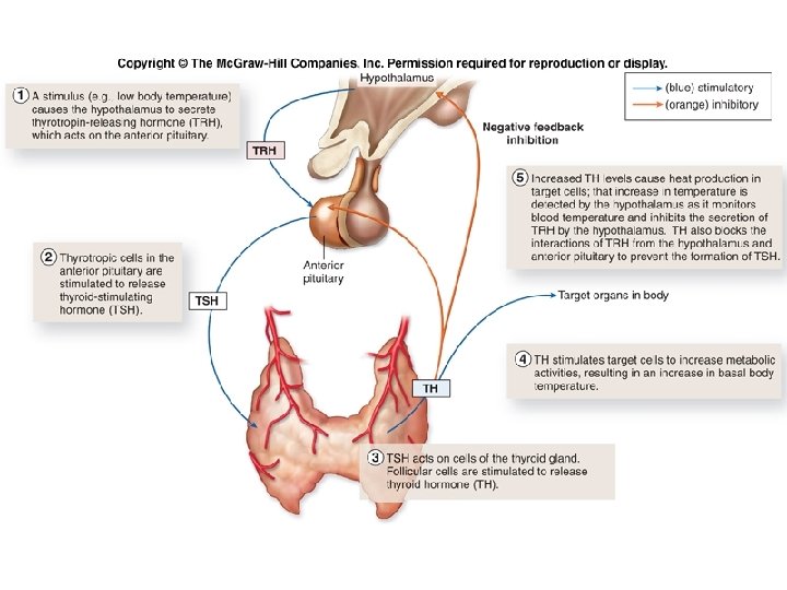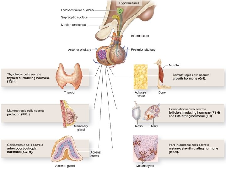 Hypothalamic Control of the Endocrine System • Master control center of the endocrine system • Hypothalamus oversees most endocrine activity: – special cells in the hypothalamus secrete hormones that influence the secretory activity of the anterior pituitary gland • called regulatory hormones – releasing hormones (RH) – inhibiting hormones (IH) • Hypothalamus has indirect control over these endocrine organs.