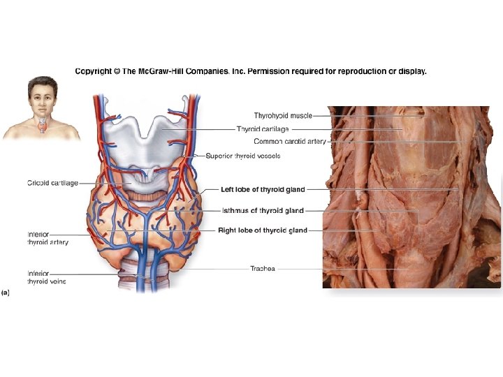 Thyroid Gland • Located immediately inferior to the thyroid cartilage of the larynx and anterior to the trachea. • Distinctive “butterfly” shape due to its left and right lobes, which are connected at the anterior midline by a narrow isthmus. • Both lobes of the thyroid gland are highly vascularized, giving it an intense reddish coloration. • Regulation of thyroid hormone secretion depends upon a complex thyroid gland–pituitary gland negative feedback process.