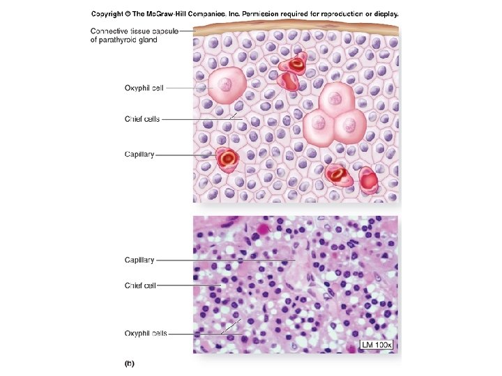 • Small, brownish-red glands – located on the posterior surface of the thyroid gland • Usually four small nodules – may have as few as two or as many as six. • Two different types of cells in the parathyroid gland: – chief cells – oxyphil cells • Chief cells are the source of parathyroid hormone (PTH). – stimulates osteoclasts to resorb bone and release calcium ions from bone matrix into the bloodstream – stimulates calcitriol hormone synthesis in the kidney – promotes calcium absorption in the small intestine – prevents the loss of calcium ions during the formation of urine • The function of oxyphil cells is not known. Parathyroid Glands