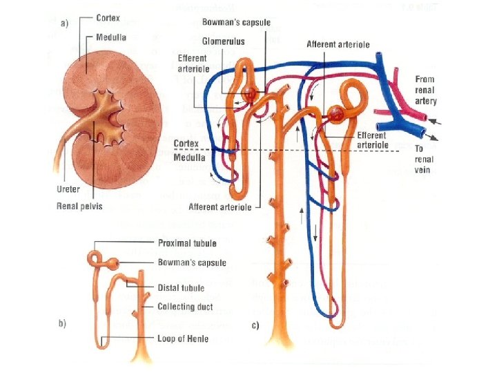 • Capillaries in glomerulus filter blood- Bowman’ capsule collects ultra filtrate • Through passive and active diffusion, 95% of water is reabsorbed, along with K, Na, Ca • Other things are actively excreted, like drugs. • Excretion is controlled by hormones such as ADH from hypothalamus