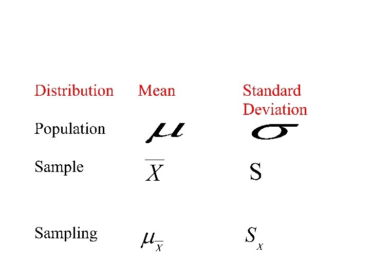 Sample Statistics • Variables in a sample • Measures computed from data • English letters for notation