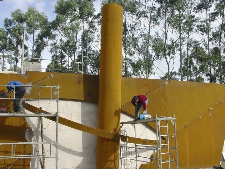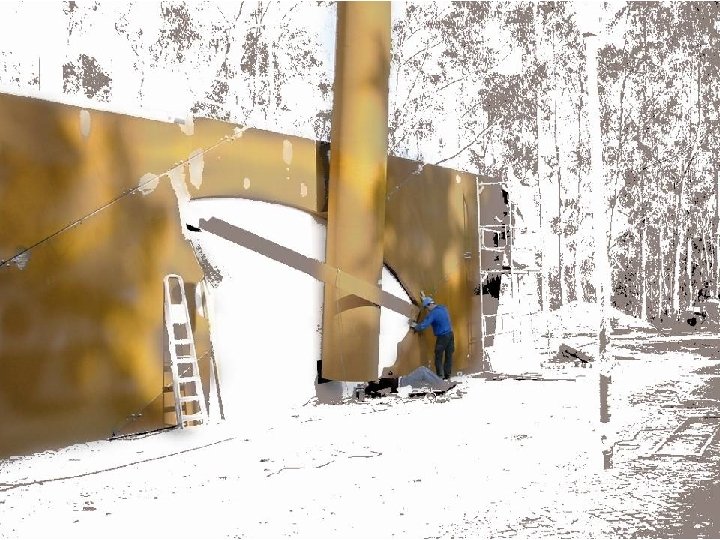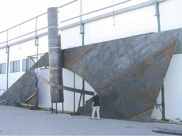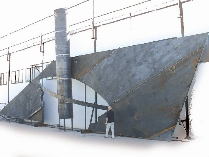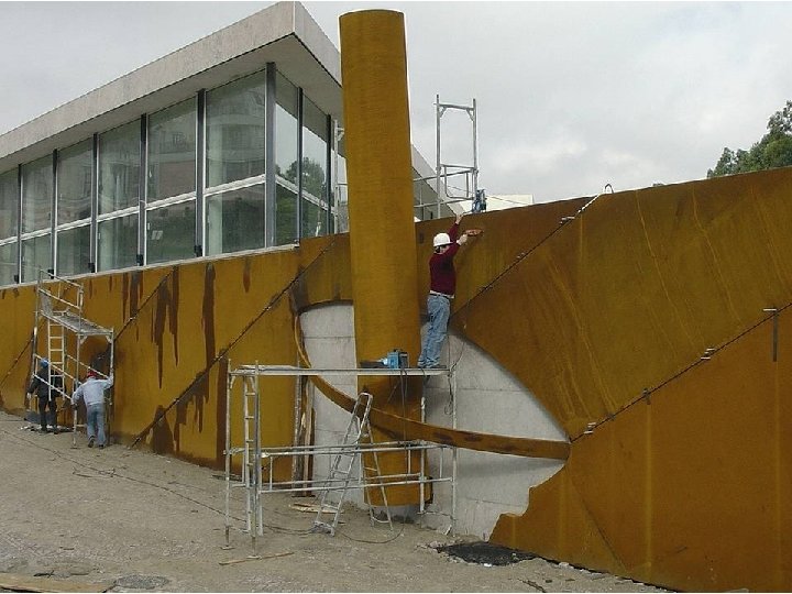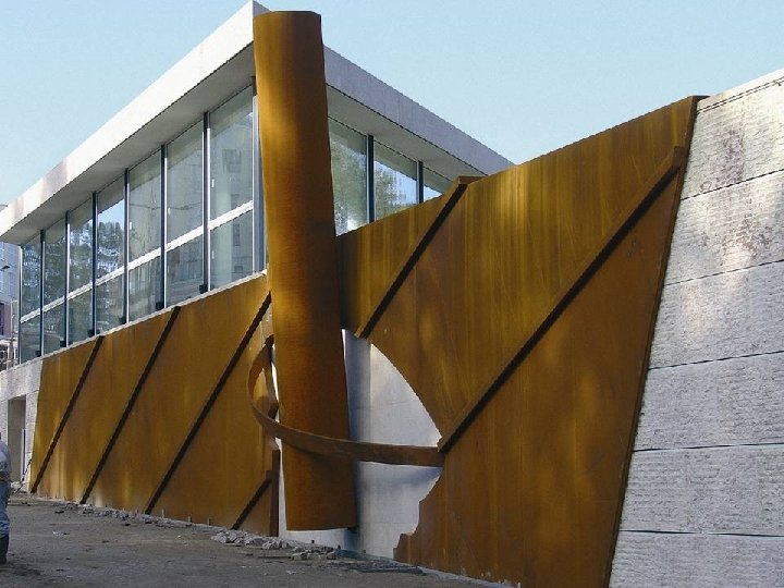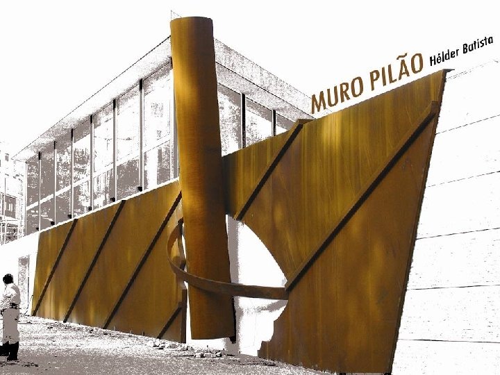 A extensão do muro e a sua implantação levaram-me a encontrar uma solução em que a sua plasticidade fosse imposta por materiais sugestivos de forma a acentuar as origens industriais deste género, e de modo a "arrancar" visualmente o muro, do barranco onde se encontra. Assim, a minha concepção baseou-se na representação arqueológica de memórias industriais (que lembram a auto-afirmação de monumentos megalíticos) cuja fascinação estava na sua grandeza e força. A força e a grandeza que procurei transmitir no muro, foram obtidas através da inundação do espaço, por chapas metálicas colocadas na diagonal. A união das chapas é feita de maneira a permitir a dilatação das mesmas. As juntas são tapadas por elementos tubulares, que para além da sua função, irão permitir uma movimentação plástica da grande superfície metálica. No lado direito da unidade metálica é aberto o perfil da parte superior de um Gral (almofariz) com inclinação, onde irá assentar o chamado Mão do Gral ou Pilão, que evoca a energia necessária para o esmagamento e mistura de qualquer produto. As tiras que ligam os bordos do almofariz e cruzam sobre o Pilão, animam o espaço aberto e acentuam a forma do Gral. O material escolhido para o conjunto é o aço-corten, por ser um material dúctil e resistente. Tem longa duração, não necessita de tratamento e oxida com o tempo, o que lhe dá uma presença fora do comum. Helder Batista