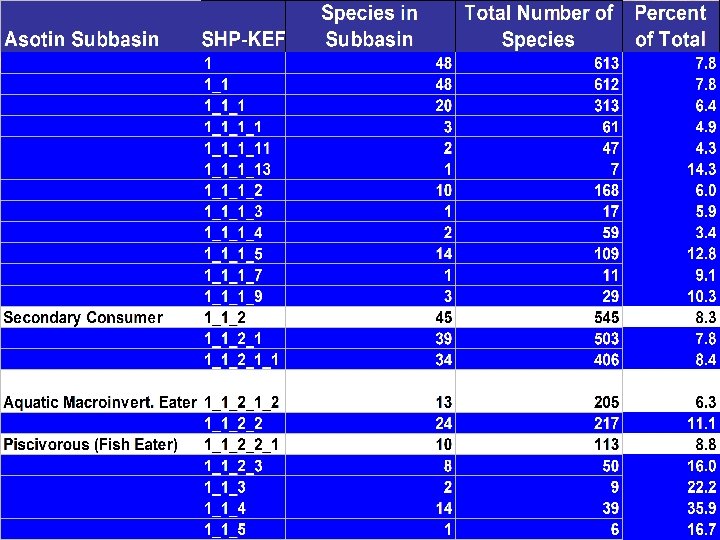 Products • Create 133 Fish and 474 Wildlife Species Range Maps- Historic and Current Distribution • Create 607 Species Functional Profiles • Create Community and Geographical Functional Patterns for each of the 62 subbasins • Create 62 Subbasin Functional Profiles based on all species within each subbasin • Conduct an Assessment of the Key Ecological Functions for each subbasion