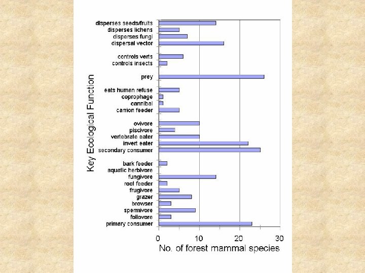 Northern River Otter has 12 Key Ecological Functions 1 Trophic relationships 1. 1 heterotrophic consumer 1. 1. 2 secondary consumer (primary predator or primary carnivore) 1. 1. 2. 1 invertebrate eater 1. 1. 2. 1. 1 terrestrial invertebrates 1. 1. 2 aquatic macroinvertebrates 1. 1. 2. 2 vertebrate eater (consumer or predator of herbivorous vertebrates) 1. 1. 2. 2. 1 piscivorous (fish eater) 3 organismal relationships 3. 12 uses burrows dug by other species (secondary burrow user) 3. 13 creates runways (possibly used by other species) 3. 2 controls terrestrial vertebrate populations (through predation or displacement)